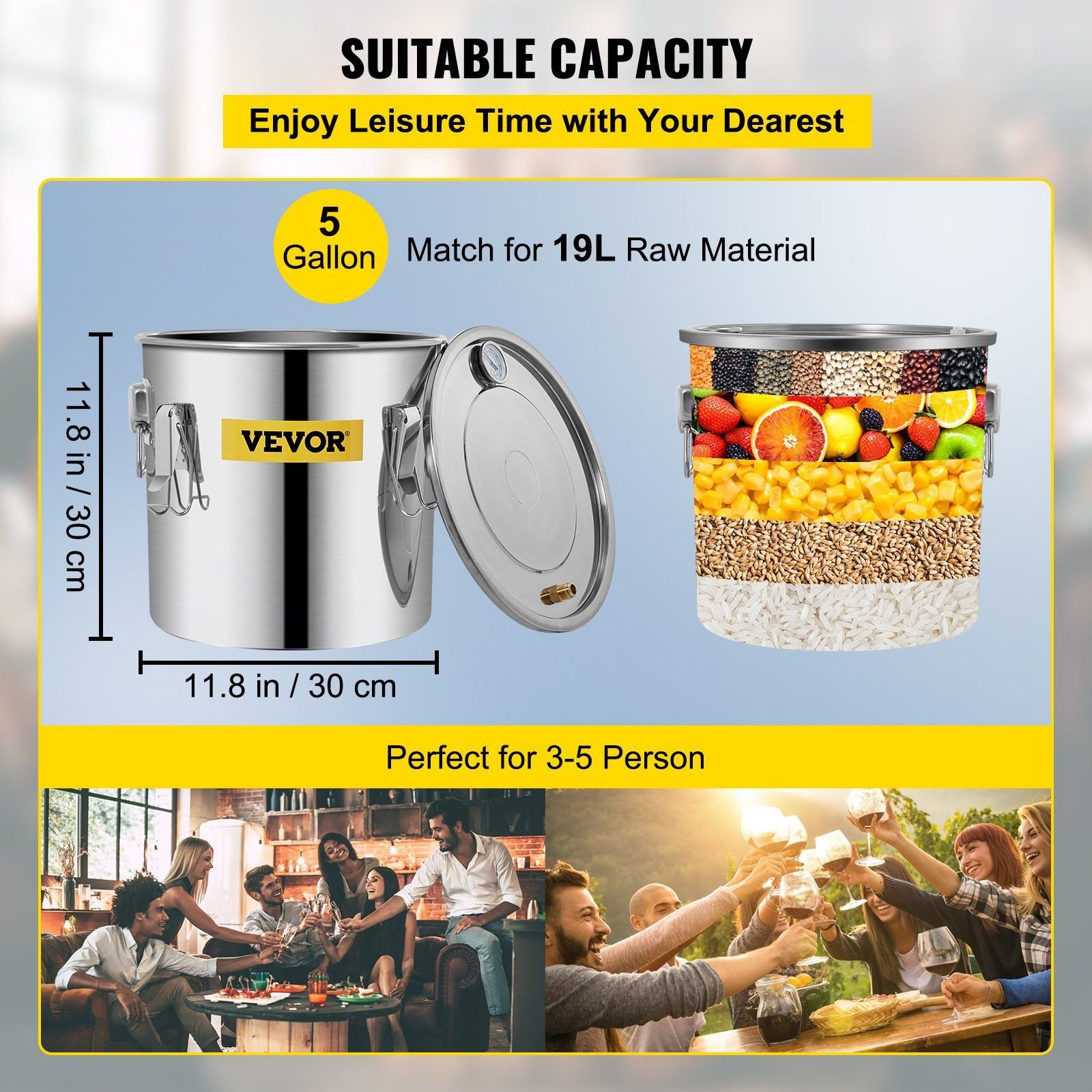 1.Sufficient Capacity: This alcohol still provides you with a fermentation capacity of 5 gallons. Boiler barrel: 11. 8" x 11. 8" (30 x 30 cm), condenser: 7.9" x 4.3" (20 x 11 cm), which can ferment up to 19 liters of raw materials. Perfect for family-together parties. All parts are made of food-grade materials, including silicone, stainless steel, and copper.