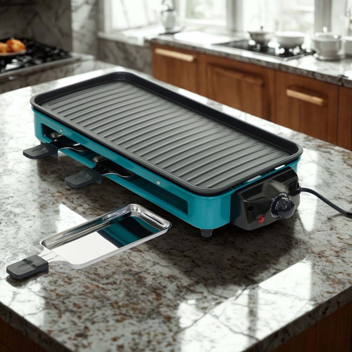 Spacious cooking surface to prepare multiple foods at once, ideal for 3-7 people.Removable non-stick grill plate for effortless cleaning.Dual-purpose design with a baking pan and grill net for versatility.Double-U stainless steel heating tube for efficient, even heating.Adjustable temperature control knob for precise cooking.
