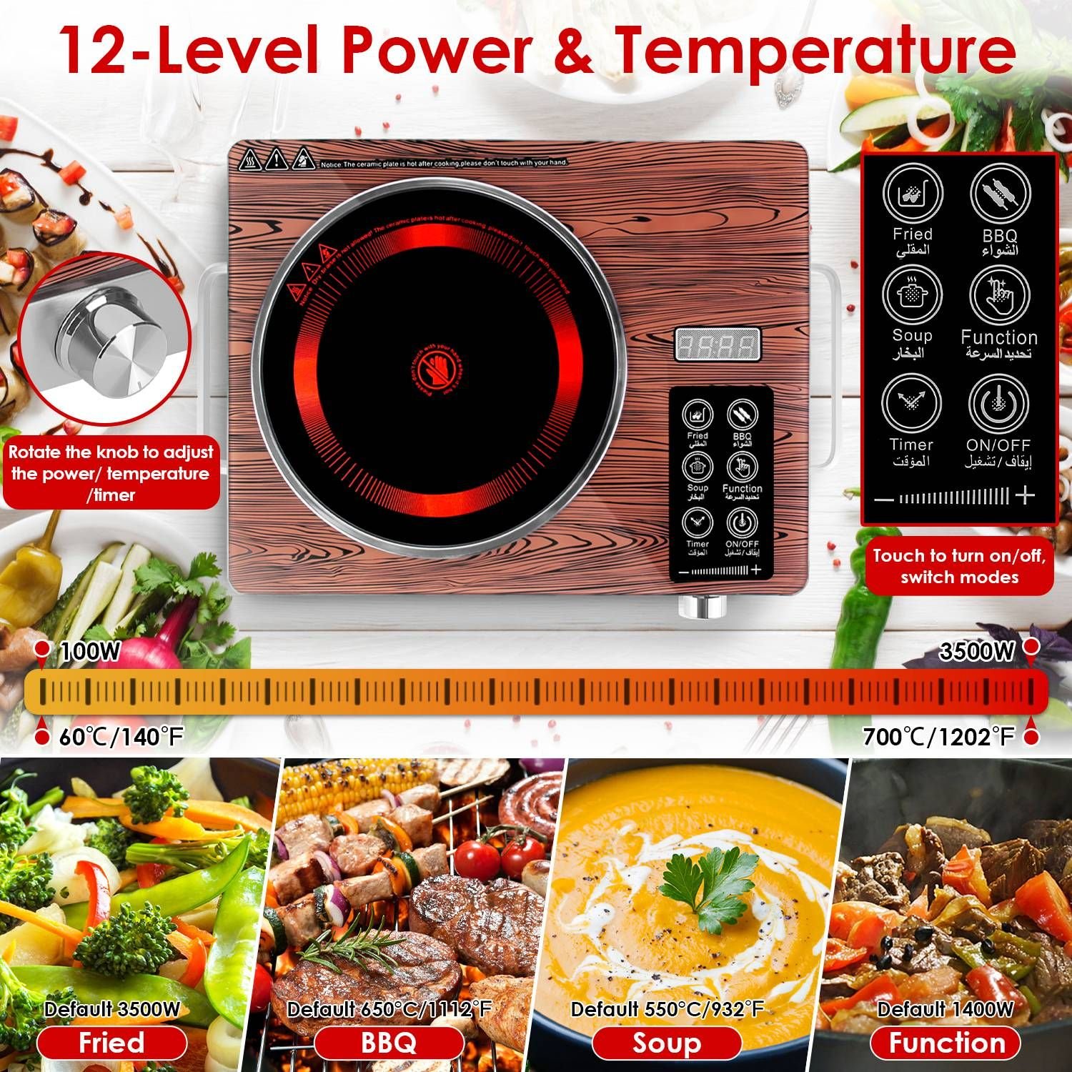 12-Level Power & Temperature Control: Adjust power (100W-3500W for Fried/Function) or temperature (140°F-1202°F for BBQ/Soup) across 12 precise levels. Perfectly control everything from slow simmering to stir-frying, boiling, hot pot, and barbecue. Enjoy versatile cooking.