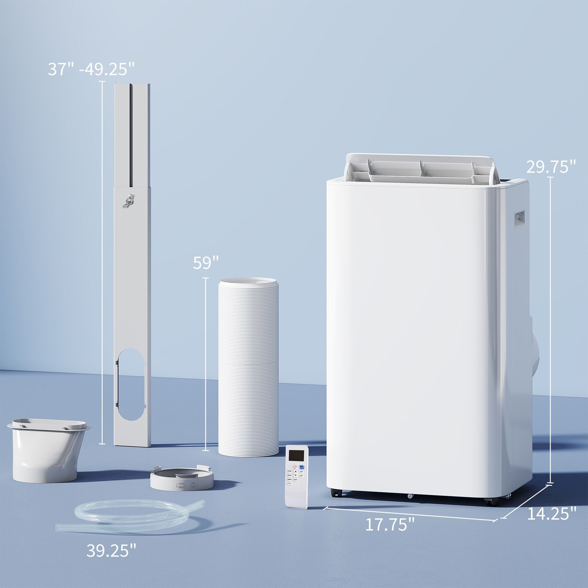 5.- Indoor AC Unit Information: Overall Dimension: 17.75''L x 14.25''W x 29.75''H, Voltage: 110-120V/60Hz. NOTE: Can only be used for sliding door windows, the exhaust hose is required to connect inside and outside when installing. If the room ac unit can not be cooled, stand for 24 hours before turning it on.